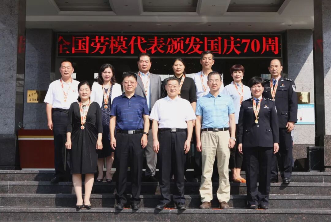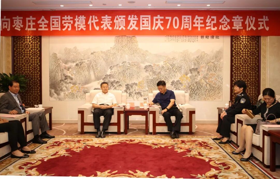 9月23日,枣庄市总工会举行仪式,向全国劳动模范和先进工作者代表颁发“庆祝中华人民共和国成立70周年纪念章”。市人大常委会副主任、市总工会主席于良为劳模代表颁发并佩戴纪念章。市总工会党组书记、常务副主席陈业江主持仪式。市总工会党组成员、副主席范晓兵等出席仪式。
