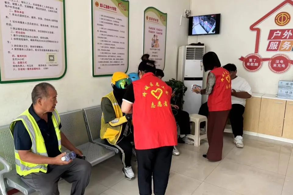 6月14日上午,市中区总工会工会干部和志愿者带着西瓜、饮料、矿泉水,来到城管蓝工会驿站,热情地向在驿站附近工作的户外劳动者招呼着。